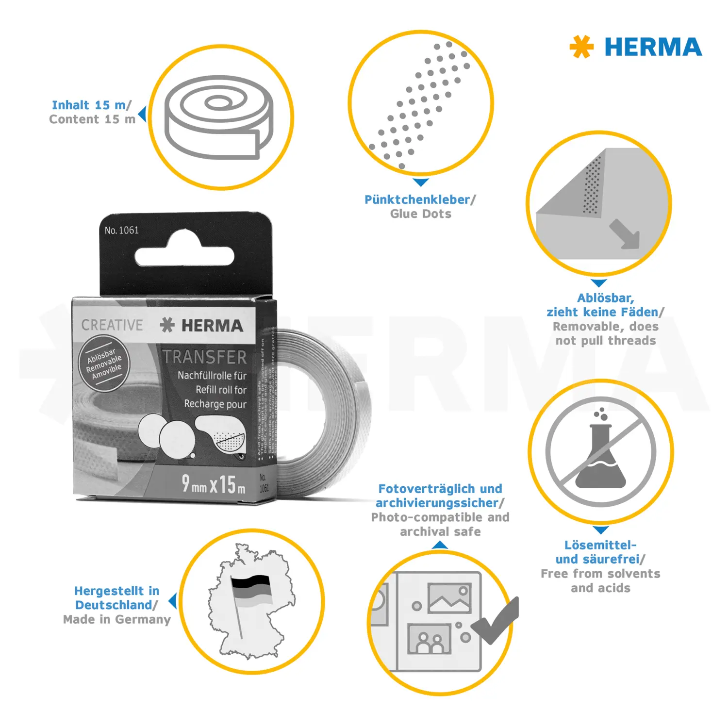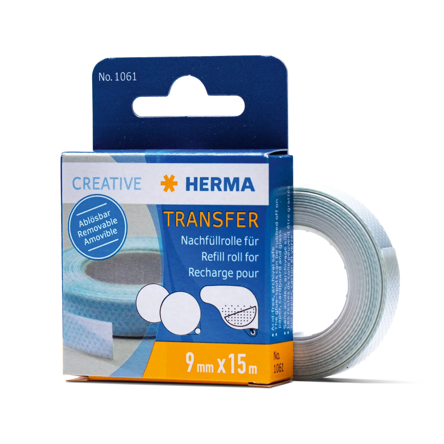 El encolado autoadhesivo y despegable se transfiere puntualmente en tiras de longitud arbitraria con tan sólo desenrollar la bobina de 15 metros de longitud, ya sea en línea recta o conturada. Adecuada para la adhesión desprendible y limpia en la oficina, el hogar, haciendo manualidades, por ejemplo, con fotos, recortes, recibos, regalos, etc. Los restos de adhesivo pueden eliminarse frotando. El adhesivo no contiene solventes ni ácidos. Con la práctica bobina de recambio de HERMA, el dispensador de adhesivo enseguida vuelve a estar disponible para el servicio: abrir el dispensador, colocar la bobina, cerrar ya está.