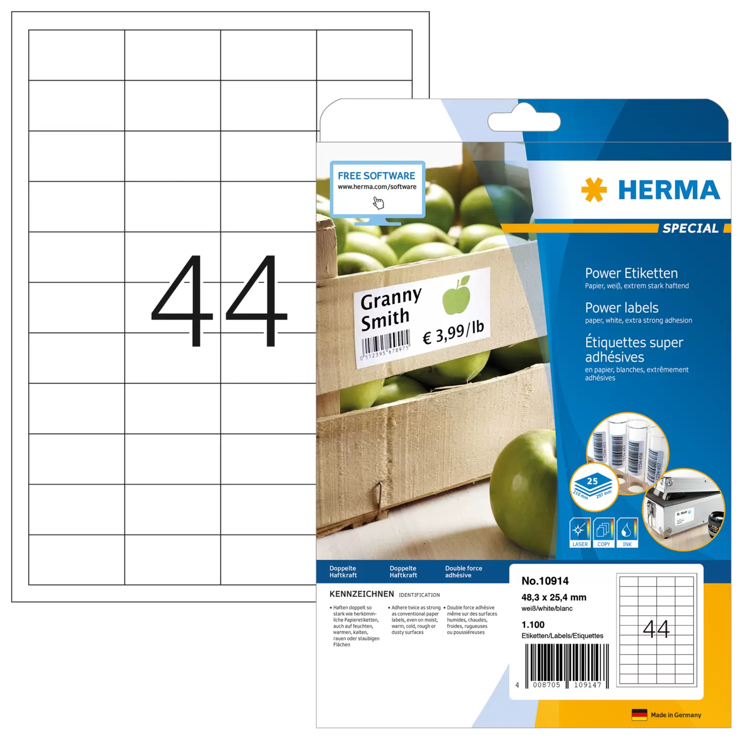 Etiquetas "Power", adherencia fuerte, A4, 48,3 x 25,4 mm, blancas, de papel