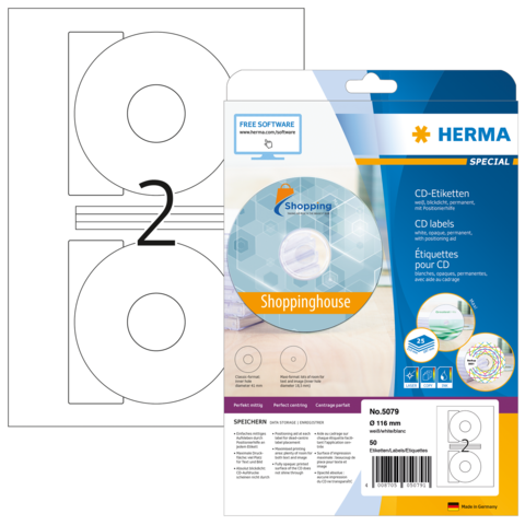 Etiquetas CD, A4, Ø 116 mm, blancas, opacas, adhesión permanente