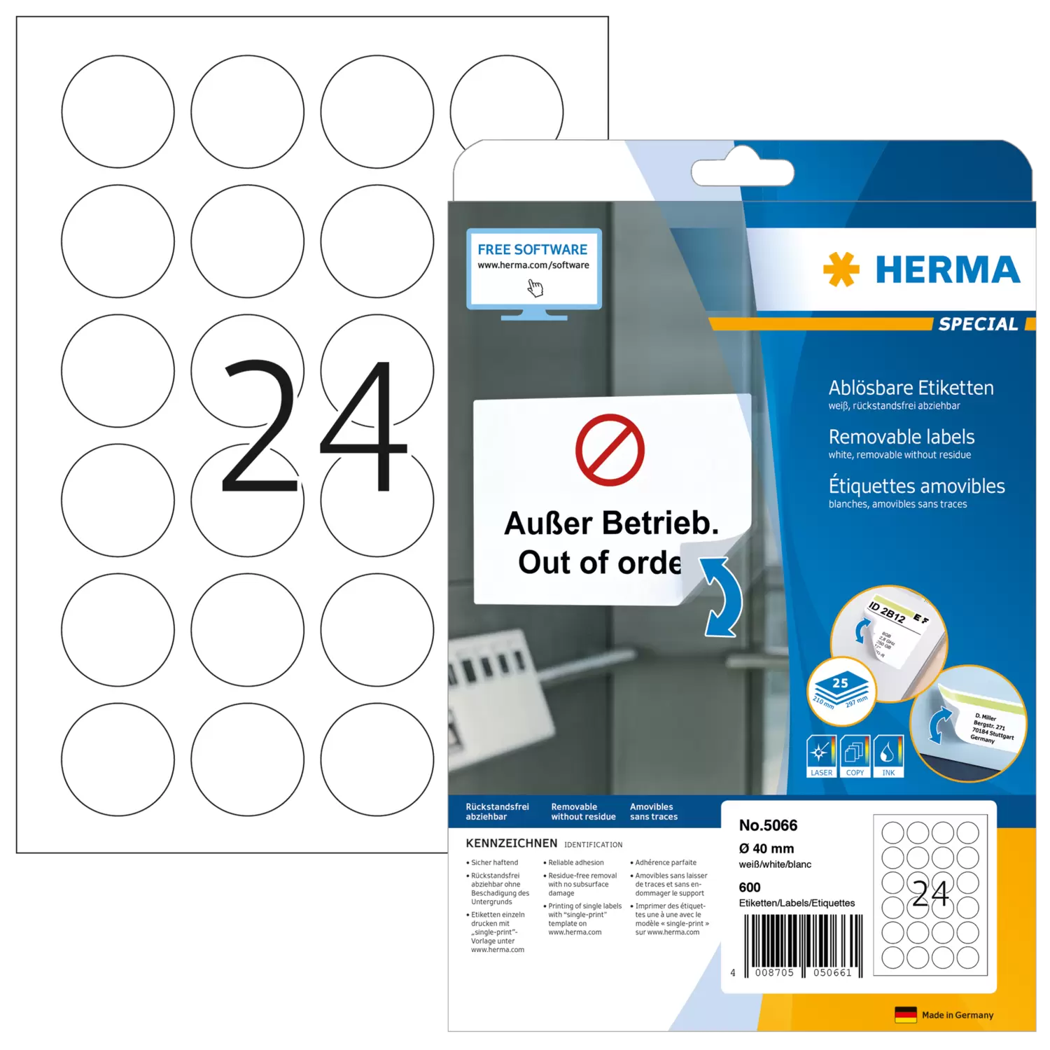 Etiquetas despegables, A4, Ø 40 mm, redondo blancas