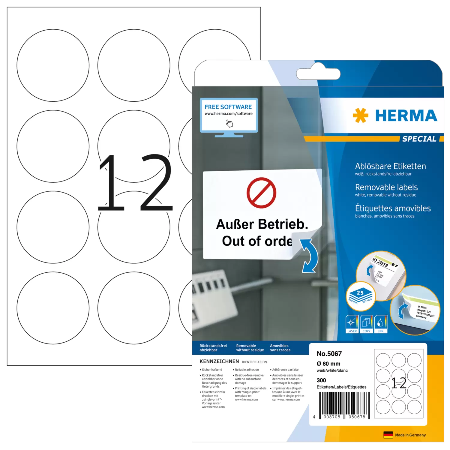 Etiquetas despegables, A4, Ø 60 mm, redondo blancas