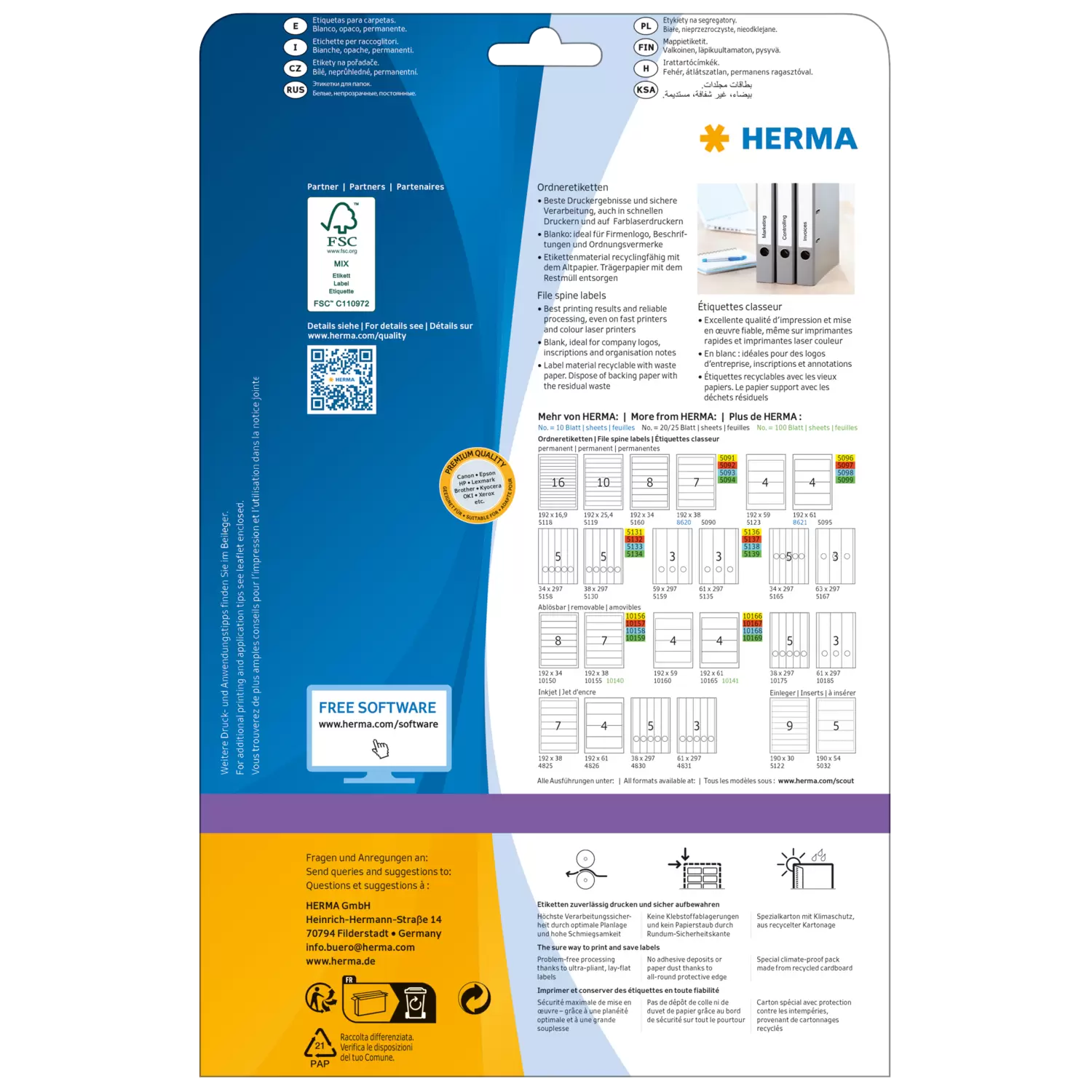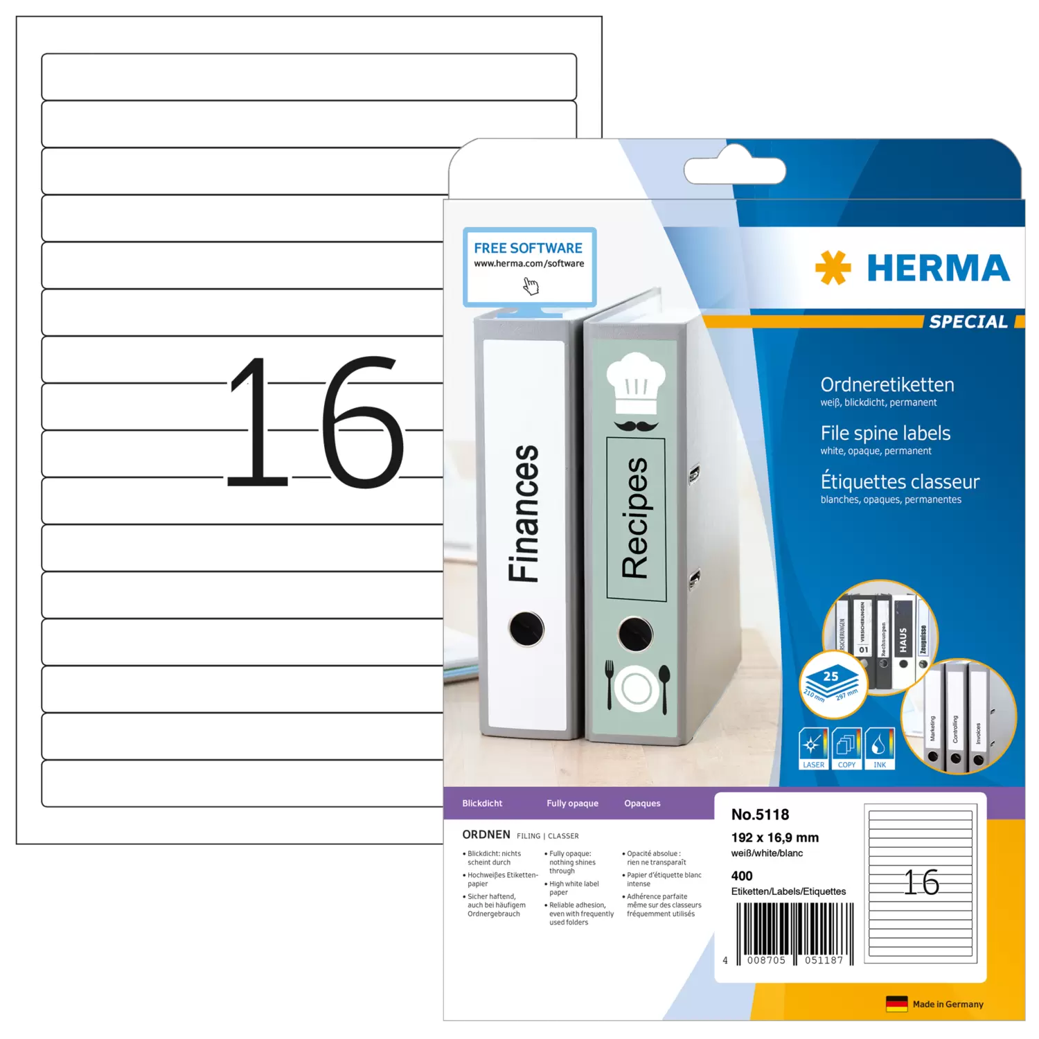 Etiquetas de archivador, A4, 192 x 16,9 mm, blancas, opacas, adherencia permanente