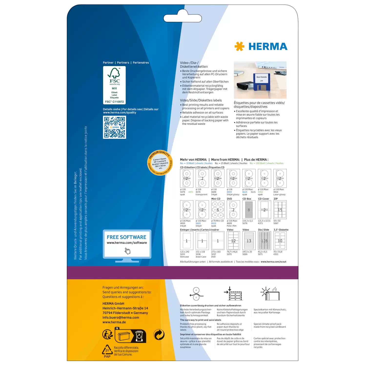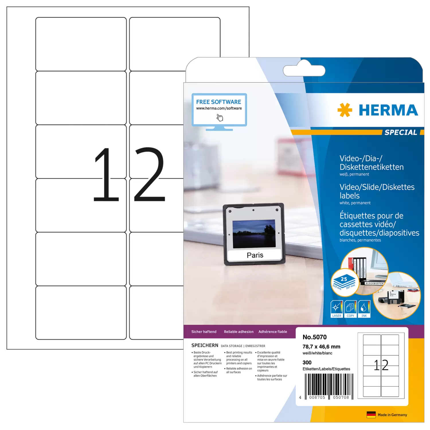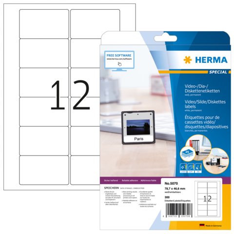 Etiquetas para cintas de vídeo VHS, sobre hojas A4, autoadhesivas. Confieren orden y claridad al archivo de vídeo: ideales para la rotulación de cintas de vídeo VHS (cara frontal o lomo). Respetuosas con el medio ambiente: papel especial de alta calidad, blanqueado sin cloro, con certificación FSC® Mix Credit, adhesivo de contacto sin solventes. Excelentes resultados de impresión en todas las impresoras láser y de chorro de tinta, fotocopiadoras, impresoras láser a color y fotocopiadoras en color. Procesamiento sin problemas gracias al borde de seguridad perimetral y la posición plana óptima. Soluciones de software gratuitas: www.herma.com/software.