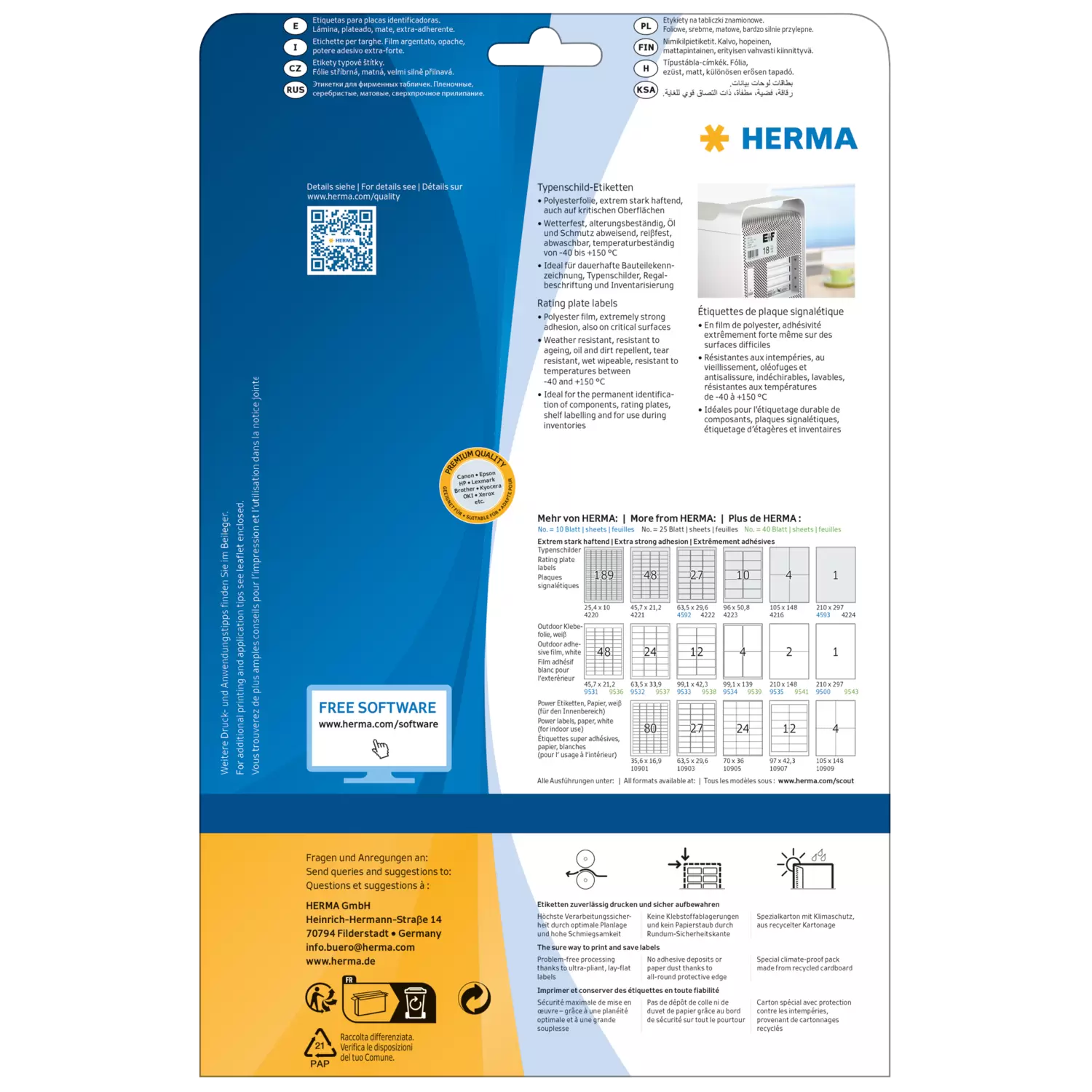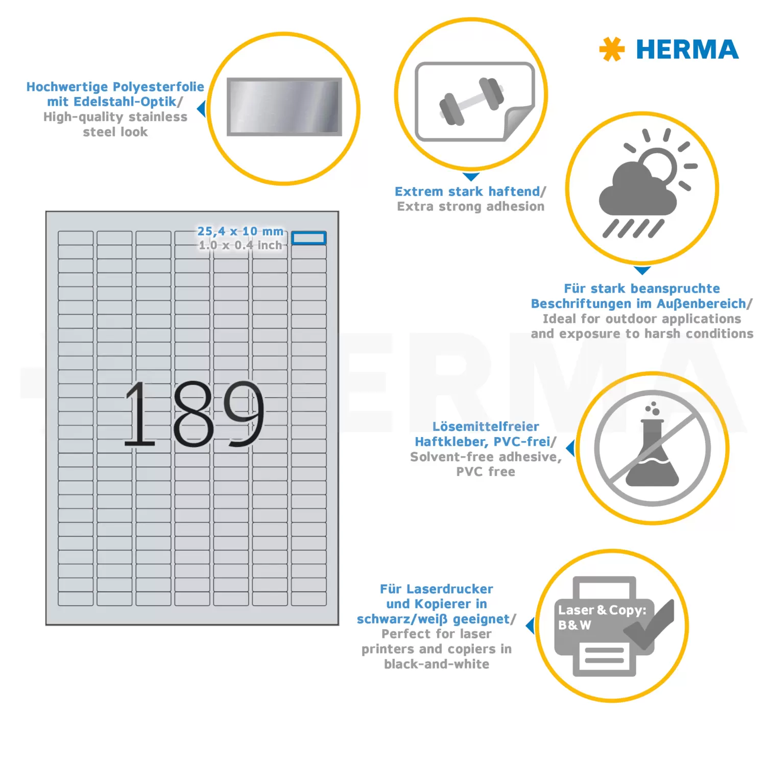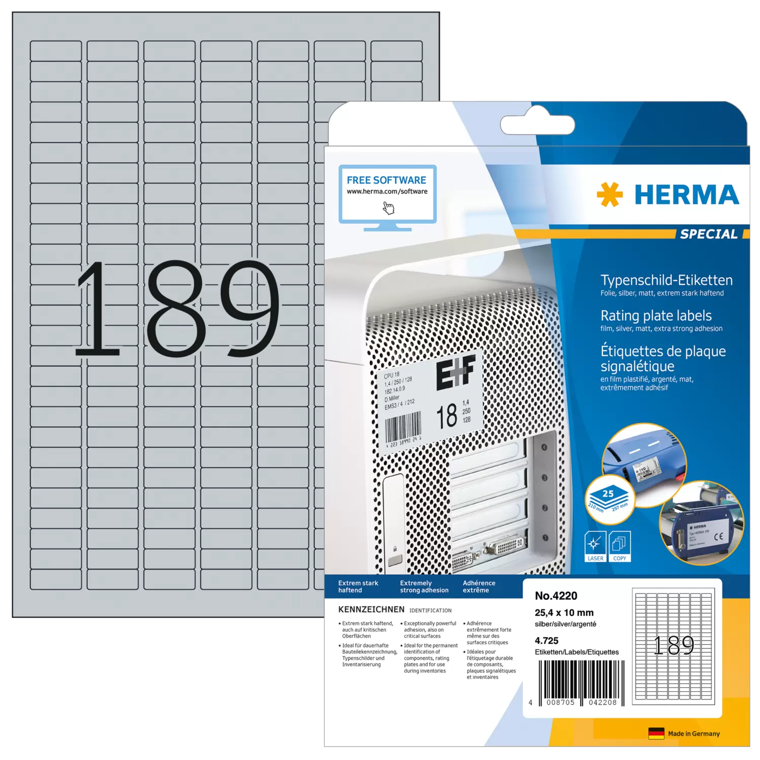 Etiqu. placa de características, plateadas, A4, 25,4 x 10 mm, adherencia extra fuerte, resistentes