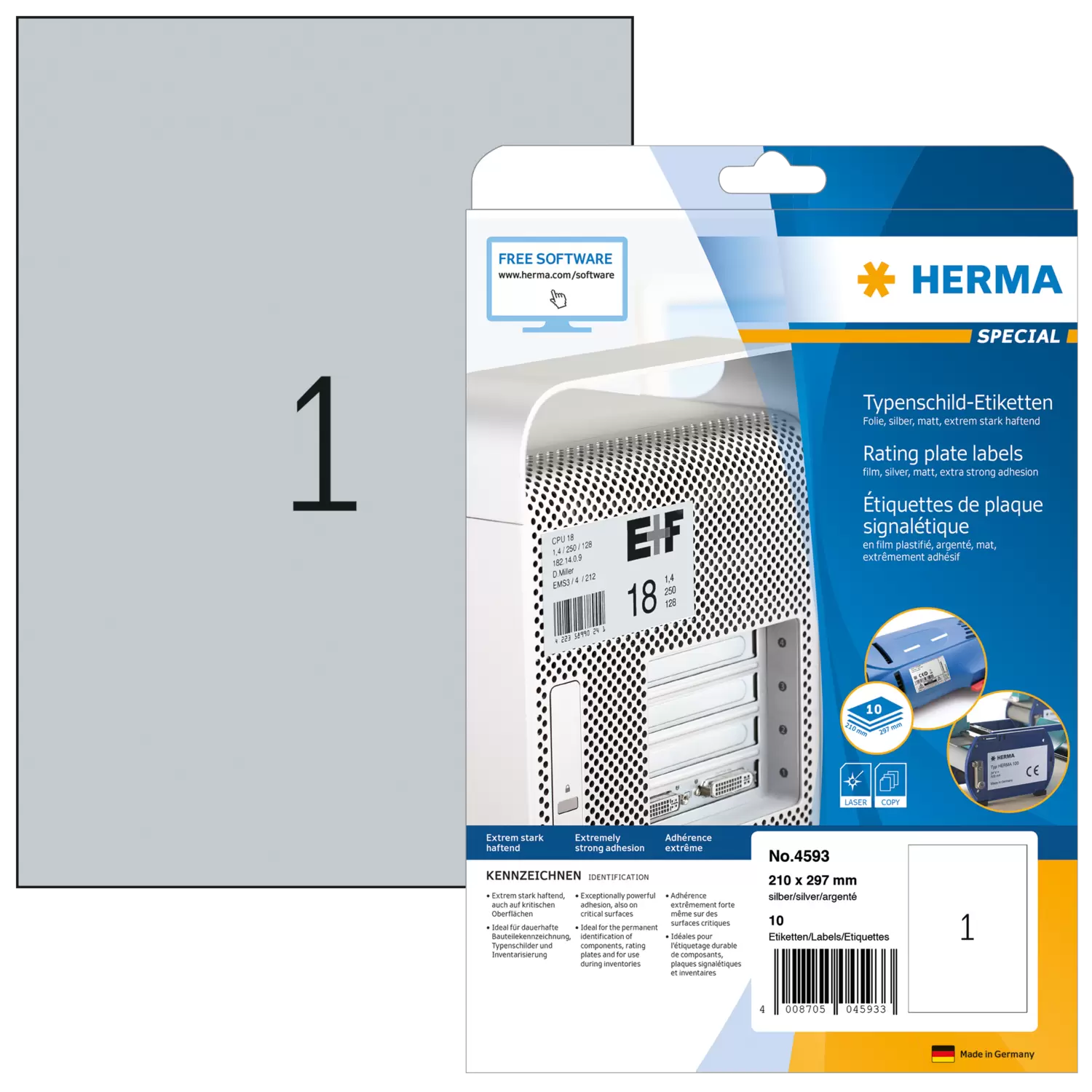 Etiquetas placa de características, plateadas, A4, 210 x 297 mm, adherencia extra fuerte, resistente