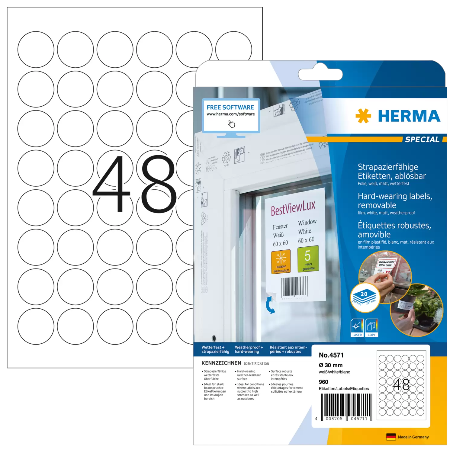 Etiquetas plásticas resistentes intemperie, A4, Ø 30 mm, despegable