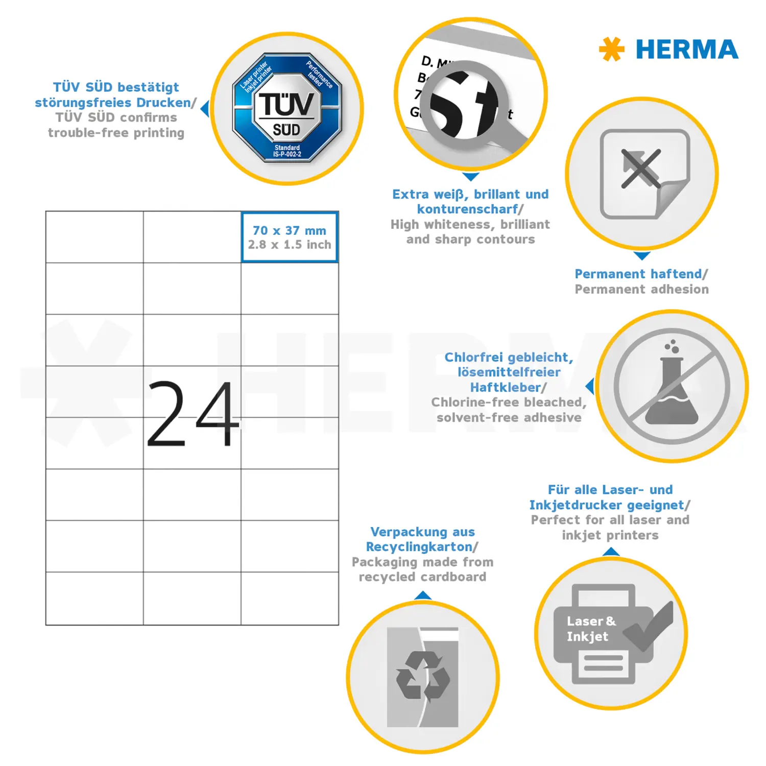 Etiquetas PREMIUM, A4, 70 x 37 mm, blancas, adherencia permanente