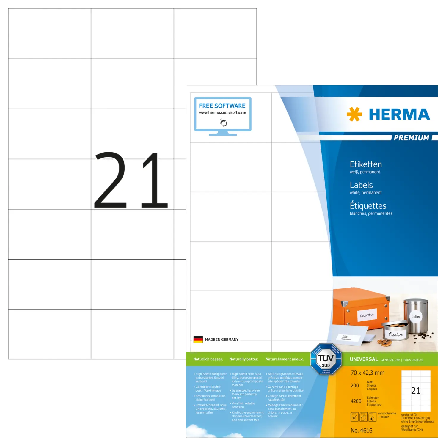 Etiquetas PREMIUM, A4, 70 x 42,3 mm, blancas, adherencia permanente